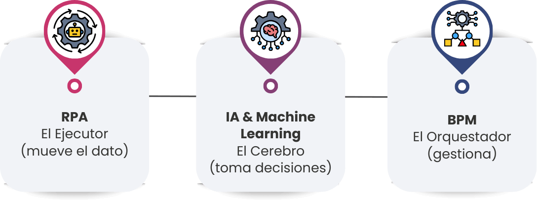 - BPM (El Orquestador): La capa de gestión que asegura que la visión sea holística, conectando sistemas, personas y bots en un flujo coherente "end-to-end".