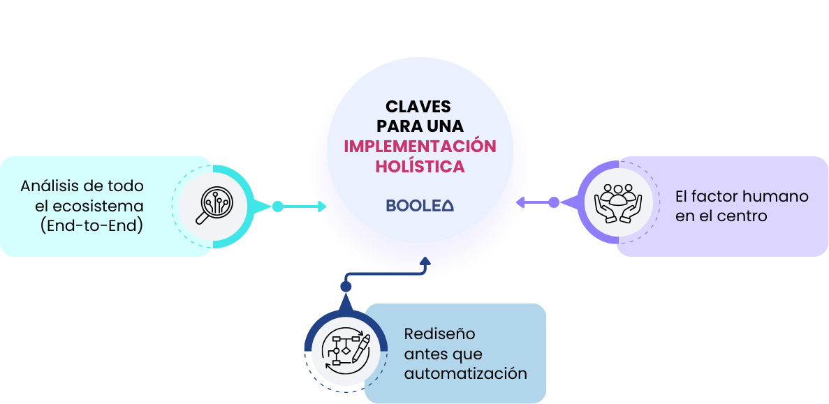 - Análisis de todo el ecosistema (End-to-End): No automatices una tarea aislada (ej. Procesar una factura) sin entender cómo afecta al resto de la cadena (compras, tesorería, relación con proveedores). La automatización debe ser transversal a los departamentos, rompiendo los silos de información.