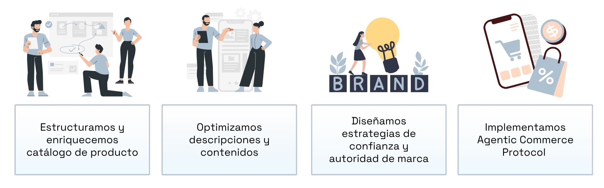En resumen, hacemos que tu marca esté lista para ser entendida, recomendada y elegida por la inteligencia artificial, cuando esta nueva forma de comprar llegue a Europa.