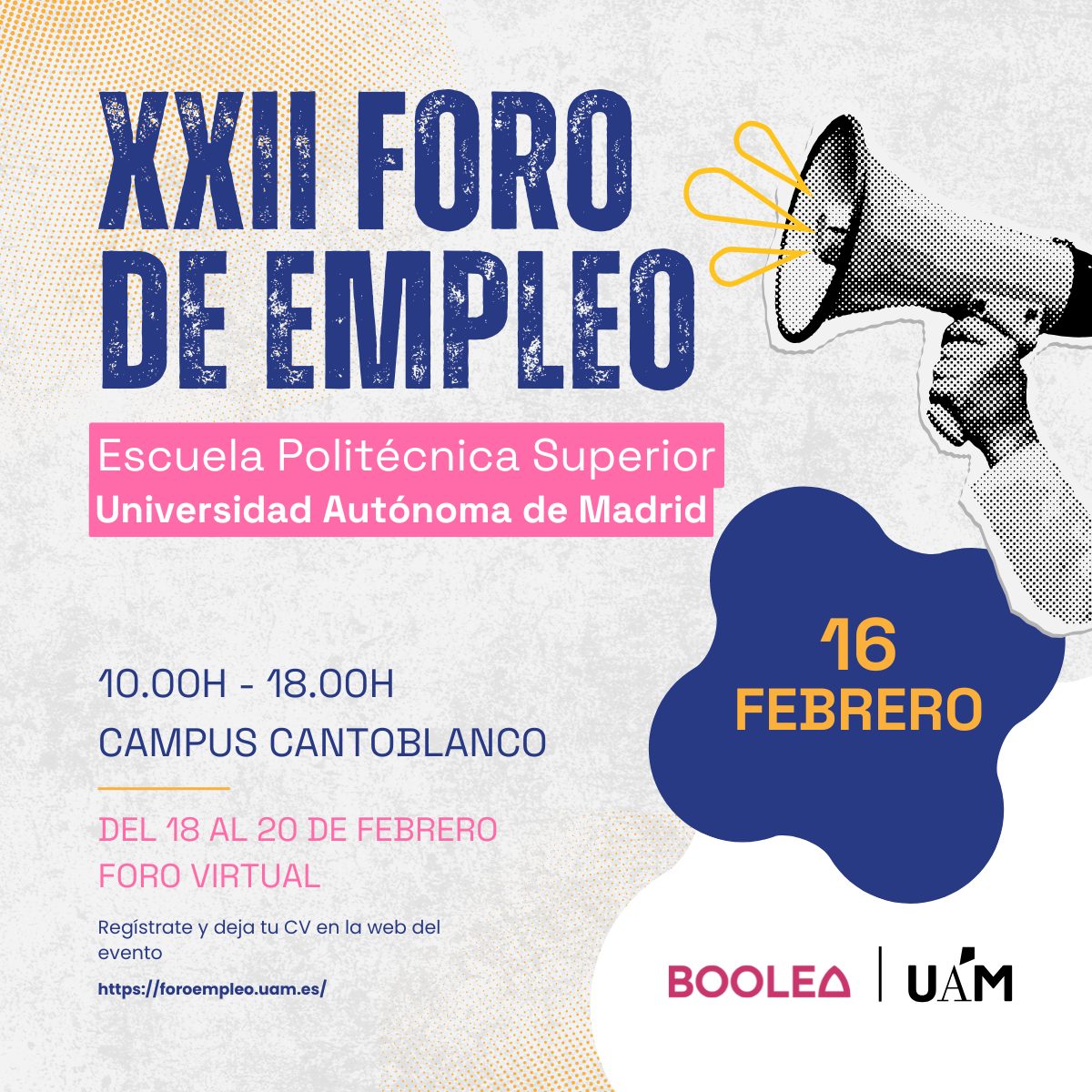 El próximo 16 de febrero estaremos presentes en el XXII Foro de Empleo de la Universidad Autónoma de Madrid, que se celebrará en la Escuela Politécnica Superior (Campus de Cantoblanco), en horario de 10:00 a 18:00 h.