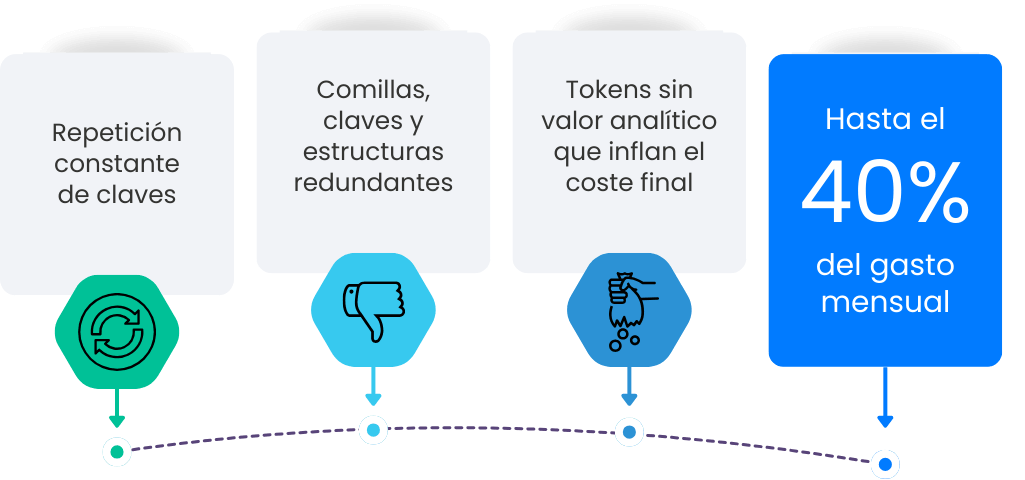 En entornos de alto volumen —call centers automatizados, agentes que procesan miles de interacciones, generación de informes diarios o pipelines de datos internos— este ruido puede representar hasta el 40% del gasto mensual.